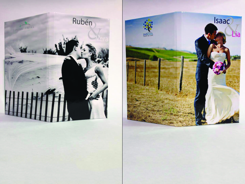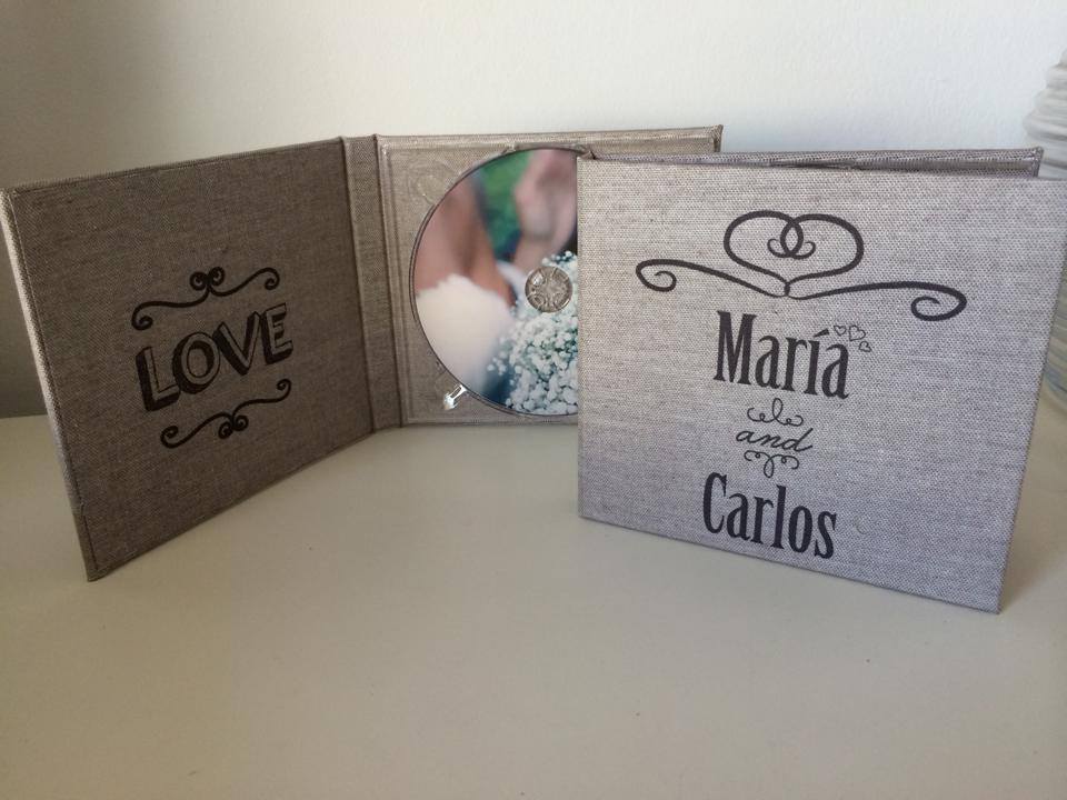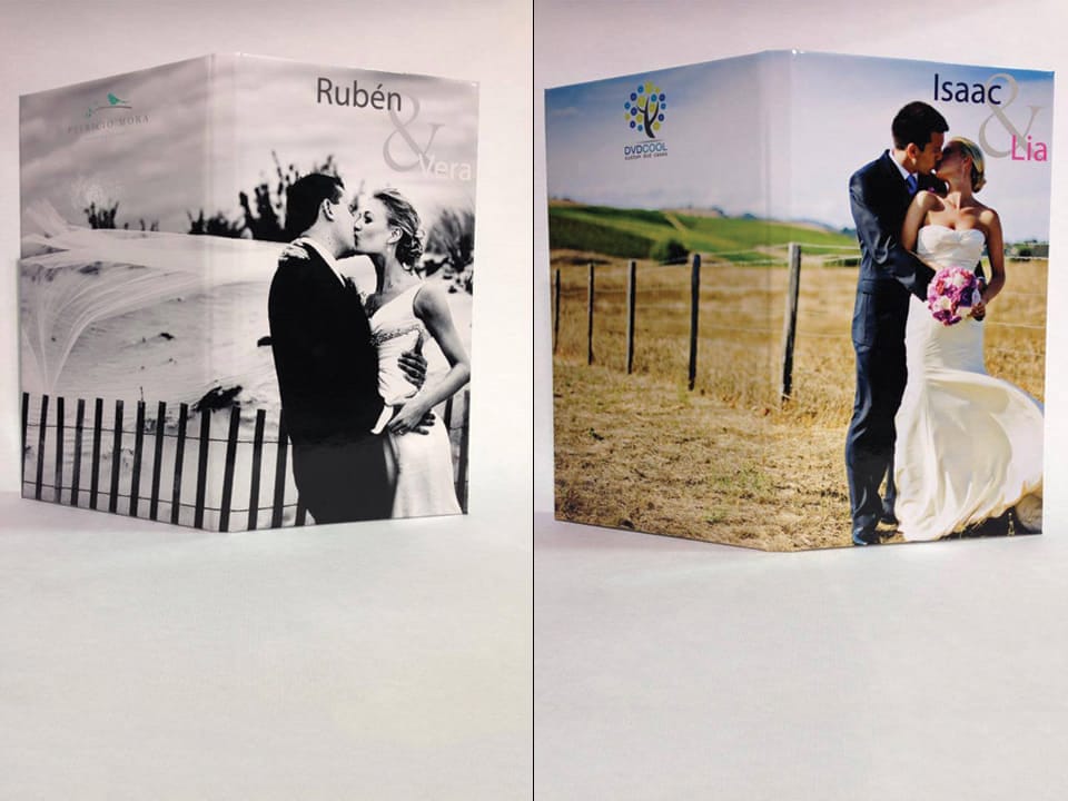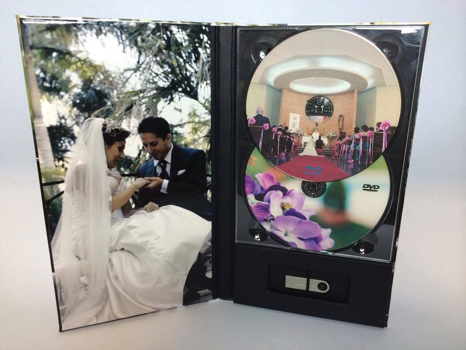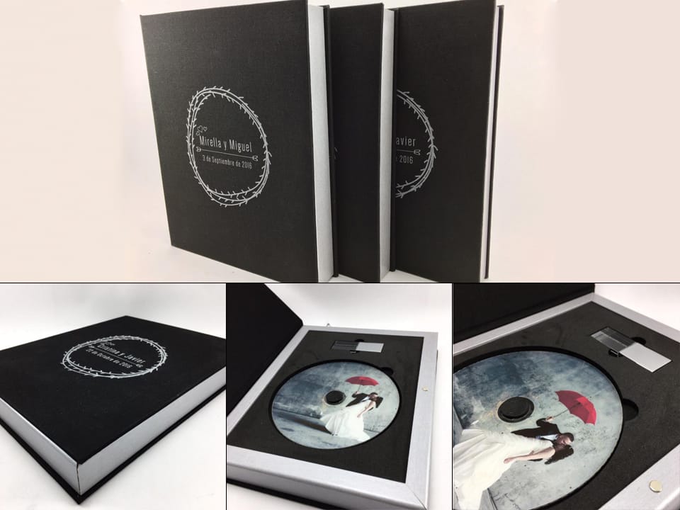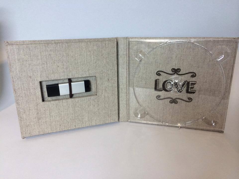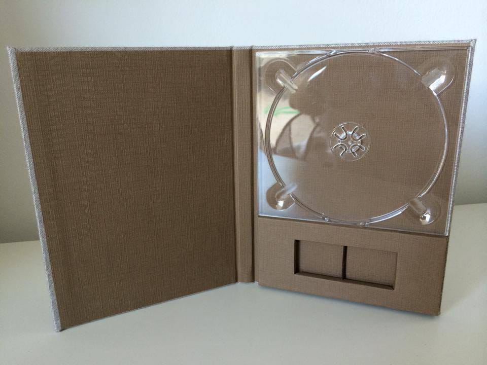 Basado en el estuche de DVD convencional, con unas medidas aproximadas de 14×25,3cm, admite acabado con portadas fotográficas mate y brillo o encuadernado en tela como el lino. En el interior podemos combinar distintas bandejas en función al soporte que queramos entregar.