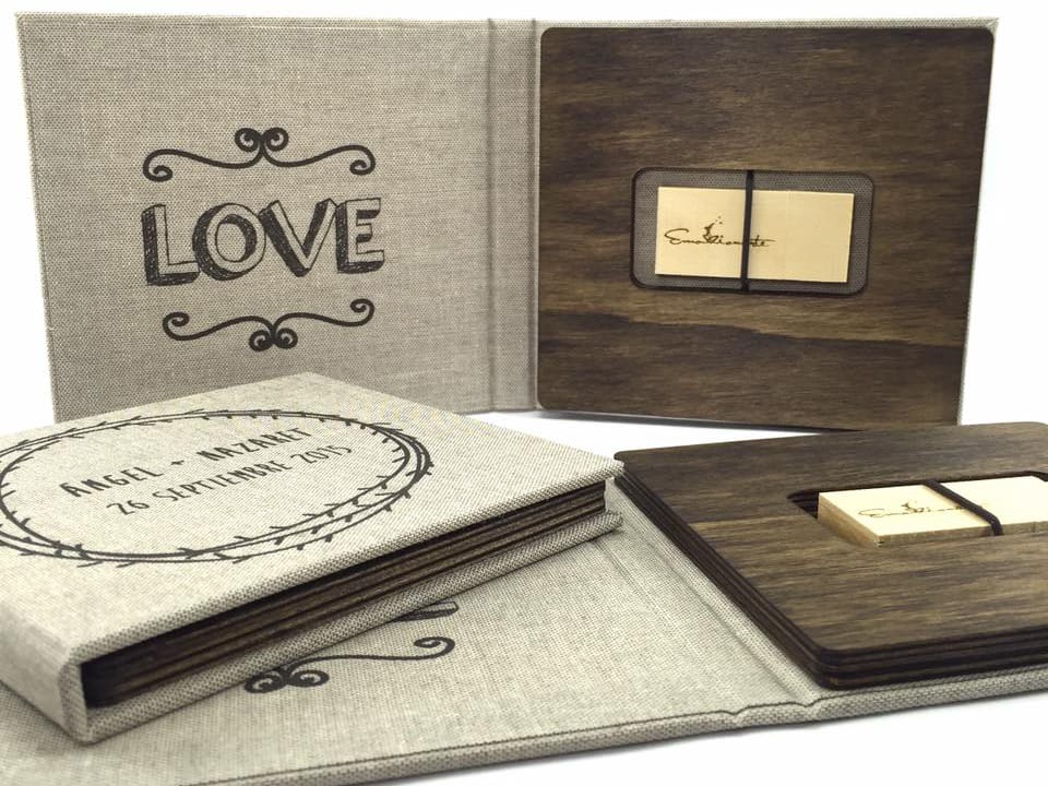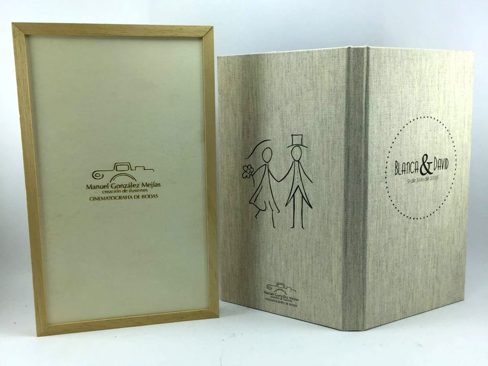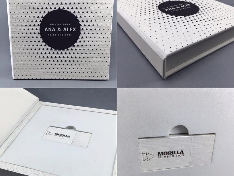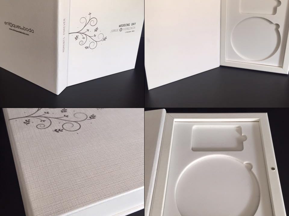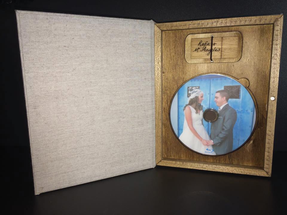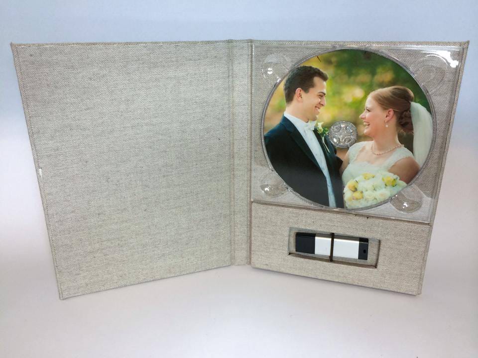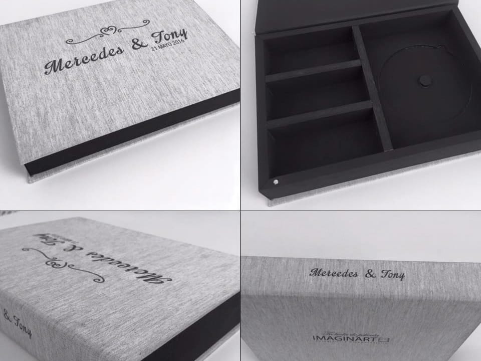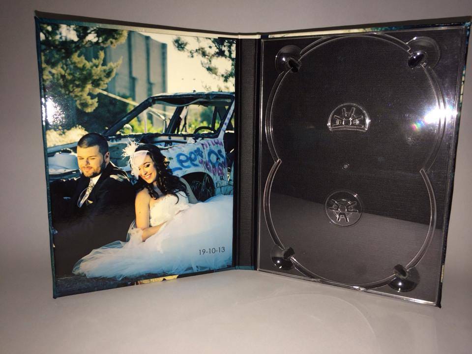 Basado en el estuche de DVD convencional, con unas medidas aproximadas de 14×25,3cm, admite acabado con portadas fotográficas mate y brillo o encuadernado en tela como el lino. En el interior podemos combinar distintas bandejas en función al soporte que queramos entregar.