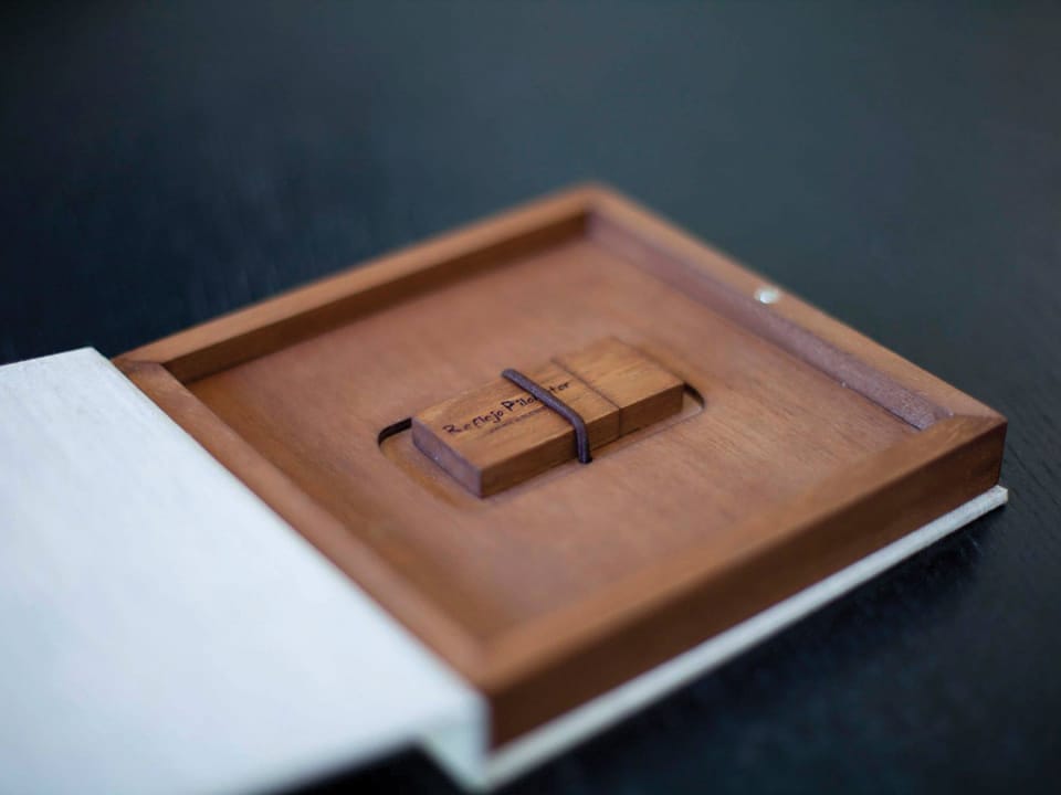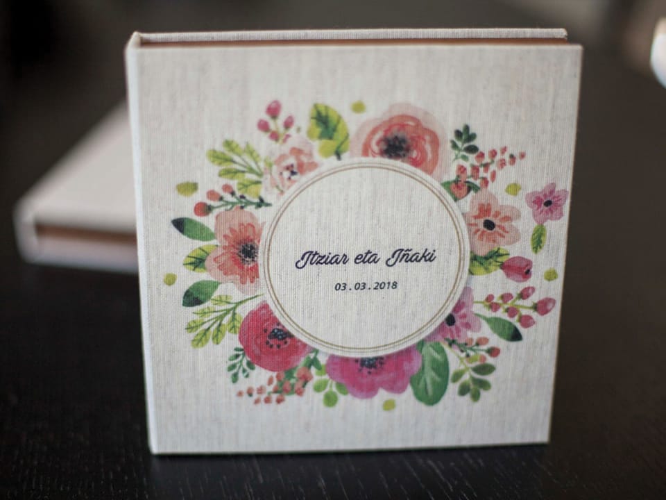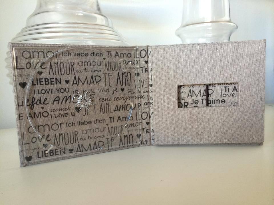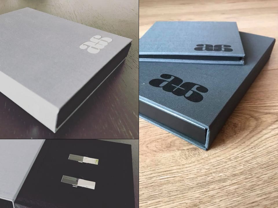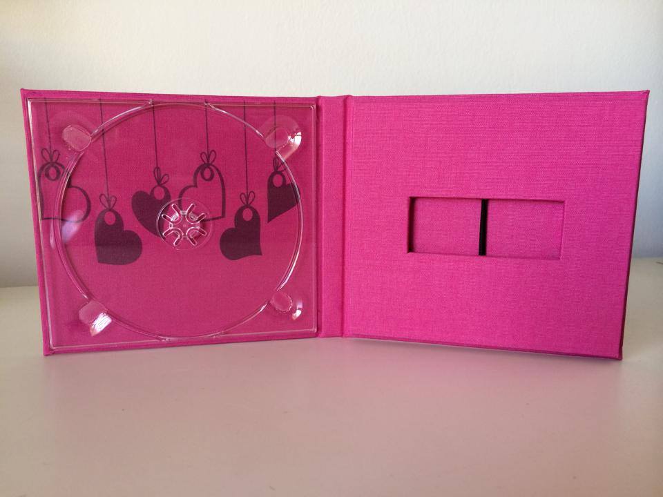 Basado en el estuche de CD convencional, con unas medidas aproximadas de 13x14cm, admite acabado con portadas fotográficas mate y brillo o encuadernado en tela como el lino. En el interior podemos combinar distintas bandejas en función al soporte que queramos entregar.