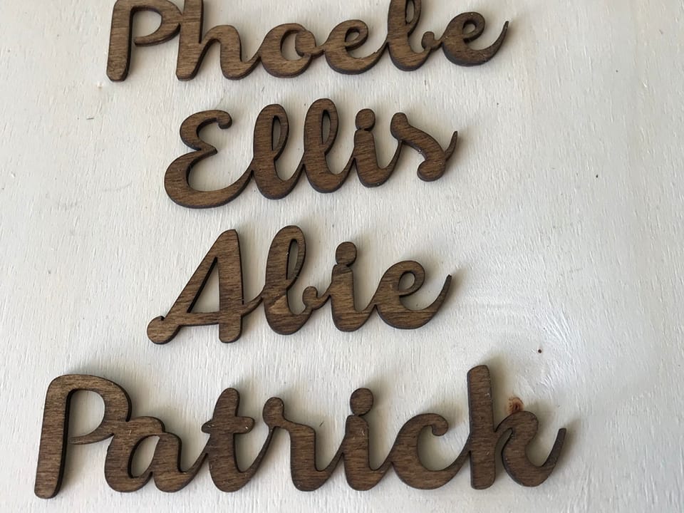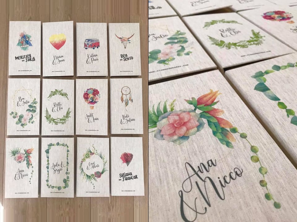 Fabricados en distintos materiales y acabados para adaptarse mejor a la decoración de cada evento. La altura de los nombres es de 3cm, el ancho es proporcional al número de letras que contenga cada nombre y el grosor varía entre 2mm y 5 mm dependiendo del material.