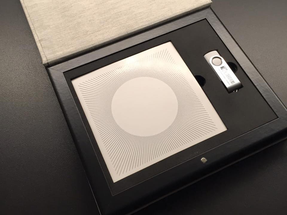 Con apariencia de libro, en su interior admite distintas configuraciones de bandeja para albergar soportes digitales así como impresos.